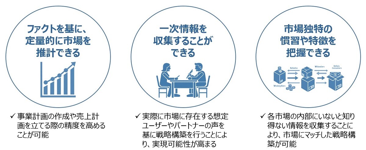 • 自社として新たな領域に舵を切るための戦略を検討する際、“推測”をベースに検討を進めることはリスクが伴います。そのため、事前の市場調査を実施をしてファクトを収集し、その上で戦略の検討を進めることが精度高い戦略構築にあたっては重要となります。